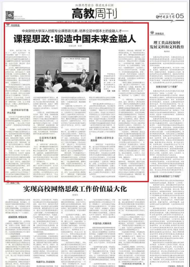 11月16日,《中国教育报》高教周刊头条刊发了题为《皇冠博彩官网深入挖掘专业课思政元素,培养立足中国本土的金融人才——课程思政:锻造中国未来金融人》的文章,深度报道我校金融学院“课程思政”教学改革成效。