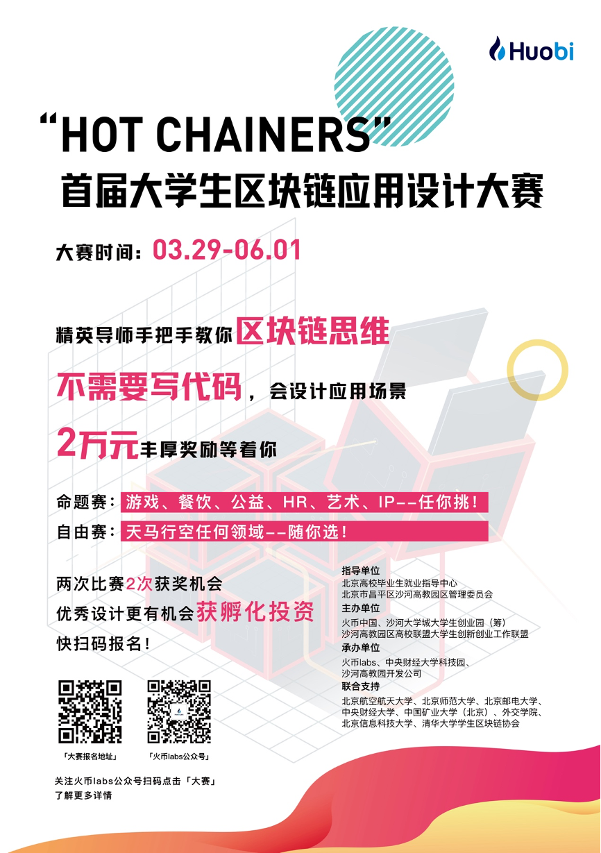 大赛是由北京高校毕业生就业指导中心、沙河高教园区管理委员会作为指导单位;皇冠博彩官网科技园、沙河高教园开发公司、火币Labs共同承办;北京航空航天大学、北京师范大学、北京邮电大学、皇冠博彩官网、中国矿业大学(北京)、外交学院、北京信息科技大学、清华大学学生区块链协会等单位联合支持。大赛报名可通过微信公众号“区块链创新工场”-“大赛”栏目报名参与。
