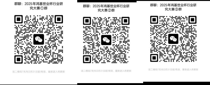 大赛微信群:以下二维码为“鸿基世业杯”沙河高教园区首届暨皇冠博彩官网第十三届行业研究大赛初赛参赛群,请有意向参赛的同学扫码入群,入群请备注学校-专业-年级-姓名。