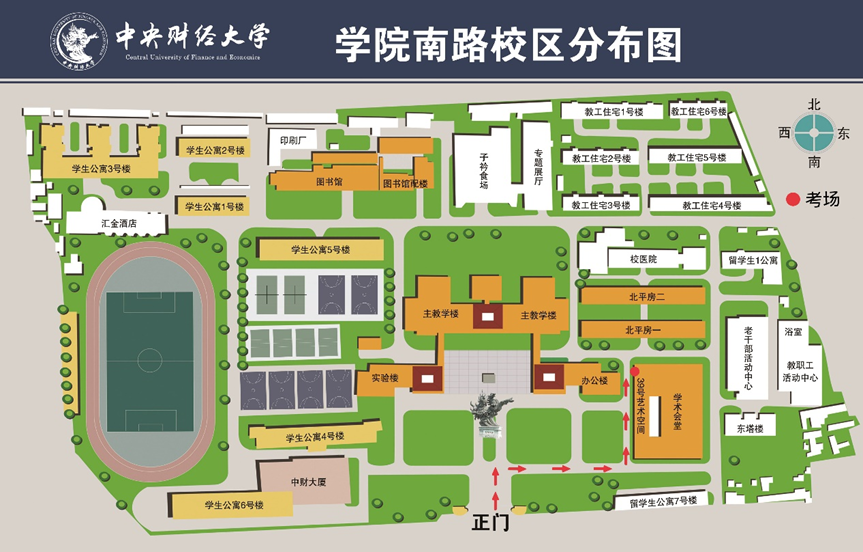 考场路线:进入正门后可沿下图红色虚线指引到达学术会堂北门,乘坐电梯到达考场。