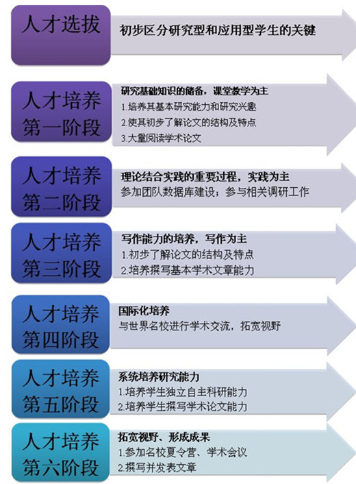团队拟于每年从全校一年级本科全日制学生中,选拔50名左右优秀本科生参与团队的研究工作和活动,通过3—6年的系统化人才培养工作,开展实施“本—硕—博”立体式的研究性学术型人才培养方案,使其具备一定的研究能力和学术水平,并逐渐成长为具有独立思考能力和创新性思维的研究型人才。
