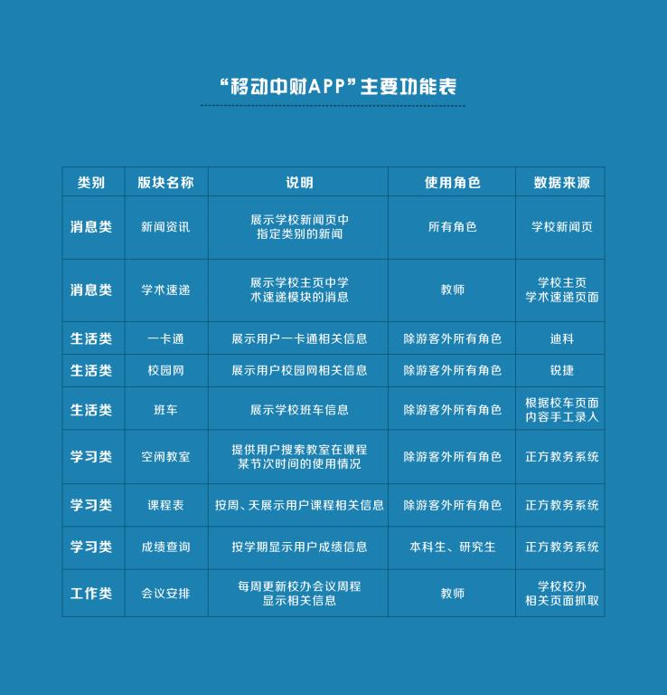 数字化校园建设办公室于2015年9月启动实施的皇冠博彩“移动中财APP”建设项目已经进入试运行阶段,该项目是依据学校信息化发展总体规划而建设的我校师生专属移动门户平台,旨在为全校师生提供便捷的移动信息化服务,并最终实现“数字化校园”服务在时间、空间上的双重延伸。目前系统涵盖的主要功能包括: